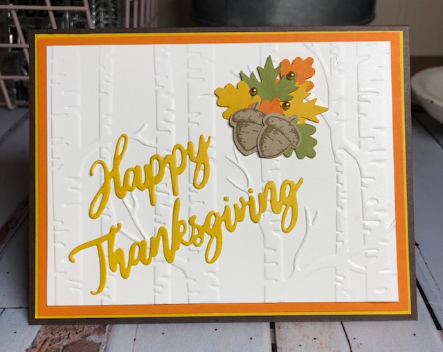 I used the Beautiful Autumn bundle for the leaves and acorn. The punch pack is to die for, especially the little acorn. I used the Word Wishes dies for the sentiment and the Woodlands embossing folder for the background. The only ink I used is Crumb Cake to stamp the acorn in a tone on tone with Crumb Cake paper. The other colors of cardstock are Old Olive, Pumpkin Pie, Cajun Craze, Early Espresso and Whisper White. I finished it off with a touch of bling using the metallic pearls.