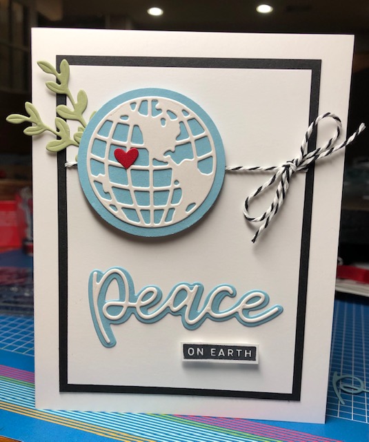 Supplies Dies- Curvy (from the upcoming mini), World Map and Stitched Be Mine (heart), 2″ Circle Punch, Peace and Joy Bundle, Black Memento ink, Black and white twine from the Playful Pets Trim Combo Pack. Cardstock- Basic Back, Whisper White, Shimmery White, Real Red, Balmy Blue and Pear Pizzazz.